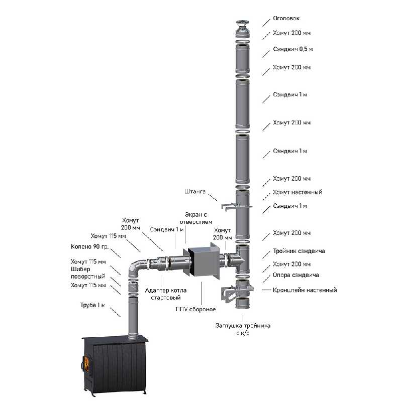 Комплект печных изделий из листовой стали, предназначенный для формирования канала, отводящего топочные газы, образующиеся при сгорании твёрдого или газообразного топлива в процессе работы теплогенерирующих устройств: печей \котлов\каминов.