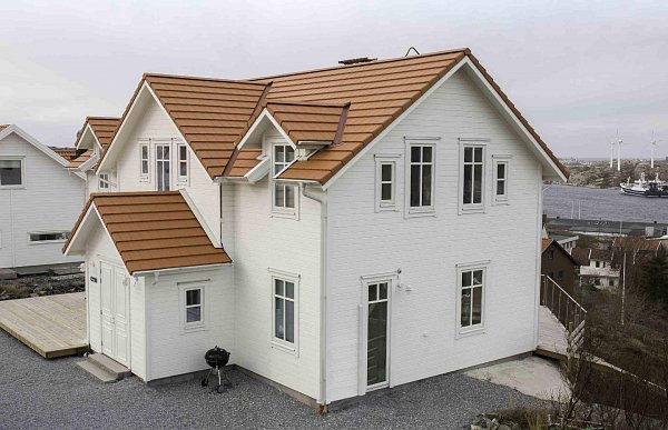 Кирпично-красный цвет черепицы придает крыше благородный и элегантный вид. Она идеально подходит для домов в классическом и современном стиле, подчеркивая их архитектурные особенности.